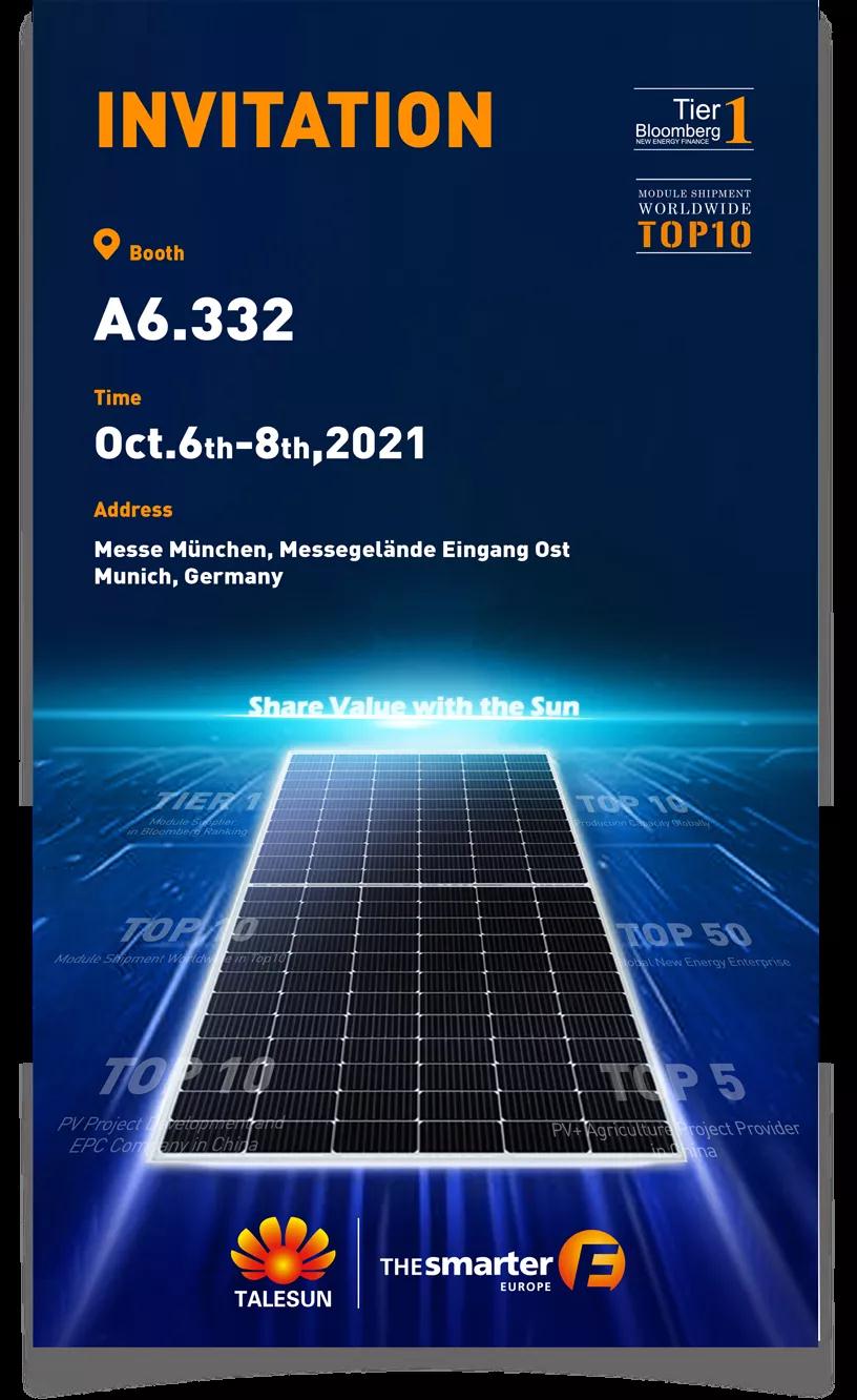 2021年歐洲智慧能源展將于10月6-8日在德國(guó)慕尼黑舉行。騰暉光伏將攜系列高效光伏組件亮相歐洲智慧能源展,歡迎蒞臨我們的展臺(tái)A6. 332。