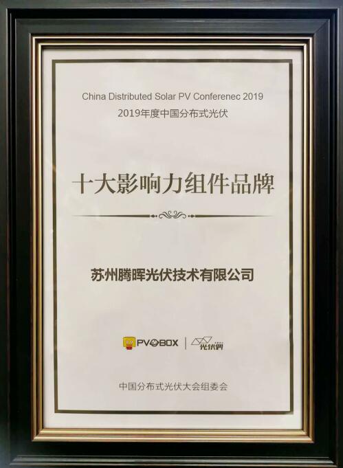 2020年7月2日,第三屆中國分布式光伏大會在山東濟南成功舉辦。騰暉光伏憑借自己高功率、高質(zhì)量、高發(fā)電量的組件產(chǎn)品、全球領(lǐng)先的光伏電站開發(fā)實力、在中國分布式光伏市場上的不斷專注投入及“光伏+”模式應(yīng)用上的不斷創(chuàng)新和應(yīng)用,斬獲“2019年度中國分布式光伏十大影響組件品牌”大獎。這也是騰暉光伏繼2017年、2018年獲獎之后,第三次獲此殊榮。
