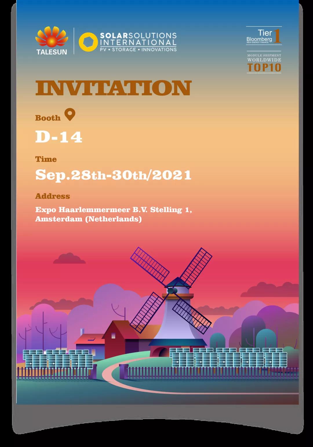 9月28-30日,2021年Solar Solutions International 展即將在荷蘭阿姆斯特丹市哈勒默梅爾會展中心隆重舉行,騰暉光伏將攜系列高效光伏組件亮相這一平臺。該展會作為西北歐最大的太陽能貿(mào)易展會之一,已經(jīng)成為荷比盧經(jīng)濟聯(lián)盟內(nèi)光伏產(chǎn)業(yè)的著名品牌盛會,眾多光伏生產(chǎn)商、安裝商、服務(wù)商以及終端用戶將齊聚一堂。