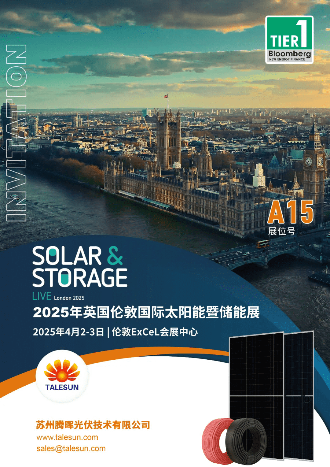 Talesun Solar will participate in the 2025 Solar & Storage Live London exhibition (April 2-4) at booth A15. The company will showcase next-generation high-efficiency PV modules, including TOPCon 600W and HJT 735W products, highlighting high power output, low degradation, and multi-scenario adaptability. Talesun invites global clients and partners to visit its booth and explore cutting-edge PV technologies.