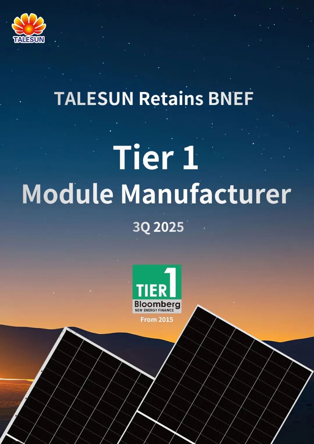 Recently, the globally renowned energy research institution BloombergNEF (BNEF) released its Q3 2025 photovoltaic module manufacturer rating list. Talesun, with its outstanding product quality, robust financial performance, and strong global market competitiveness, has once again been recognized as a Tier 1 module manufacturer for Q3 2025.