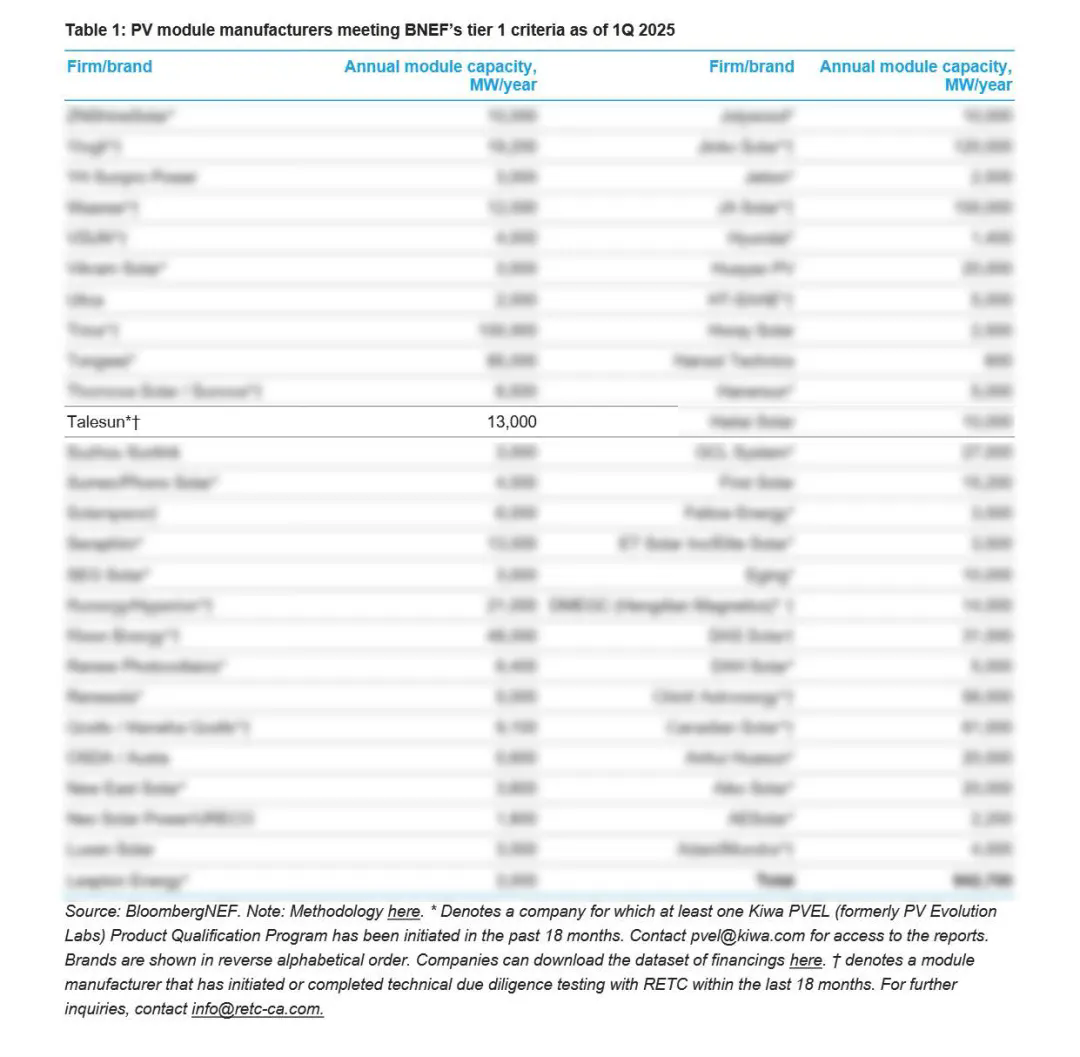 Recently, the globally renowned research firm BloombergNEF (BNEF) released its Q1 2025 PV Module Maker Tier 1 List. Talesun Solar has successfully be selected its position on this prestigious list, showcasing exceptional technological innovation capabilities, robust financial performance, and global market influence.