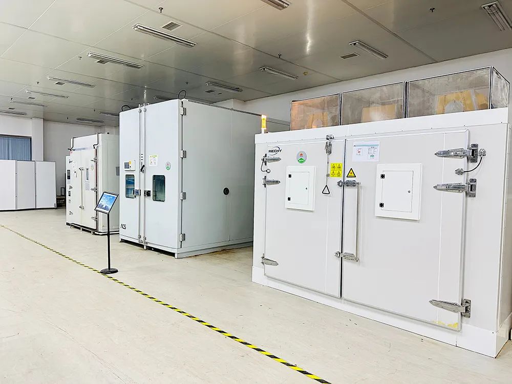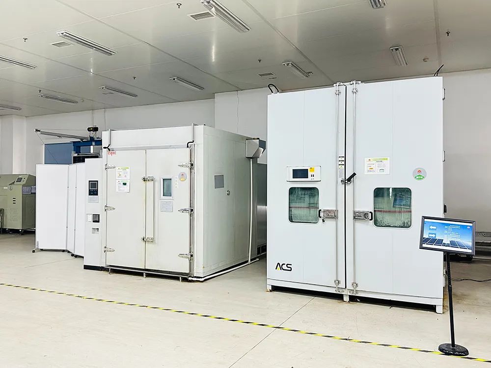 The Testing Center spans 2,000 m2 with a total investment exceeding 30 million RMB. It is equipped with over 40 advanced instruments from domestic and international sources and staffed by a team of professional testing personnel. The center comprises four functional laboratories: Material Testing Lab, Safety Testing Lab, Performance Testing Lab, and Environmental Testing Lab. It supports a comprehensive range of tests, including product certification processes, module reliability testing, highly accelerated aging tests, and material evaluation and research. The center meets international photovoltaic testing standards such as IEC 61215, IEC 61730, and UL 61730, with testing capabilities broadly covering international standard test items from IEC, UL, and other bodies.